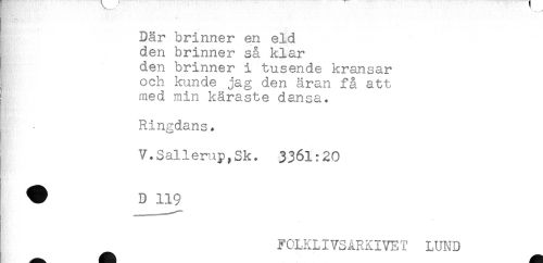 //// Där brinner en eld //// i den brinner så klar //// ! den brinner i tusende kransar //// ! och kunde jag den äran få att //// med min käraste dansa. //// Ringdans. //// V.Sallerup,Sk. 336lr20 //// FOLKLIVSARKIVET LUND ////