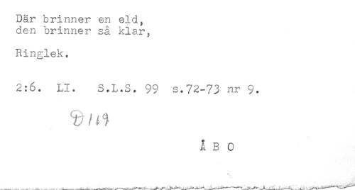 //// Där brinner en eld, //// den brinner så klar, //// Ringlek. //// 2:6. LI. S.L.S. 99 s.72-73 nr 9. //// ÅBO ////