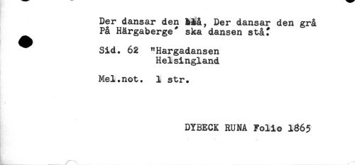 //// Der dansar den Må, Der dansar den grå //// På Härgaberge* ska dansen stå? //// Sid. 62 "Hargadansen //// Helsingland //// Mel.net. 1 str. //// DYBECK RUNA Folie 1865 //// ** //// f ////
