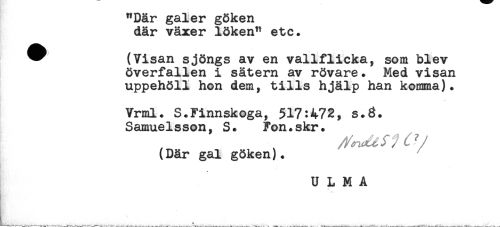 //// "Där galer göken //// där växer löken" etc. //// * (Visan sjöngs av en vallflicka, som blev //// överfallen i sätern av rövare. Med visan //// uppehöll hon dem, tills hjälp han komma). //// . //// Vrml. S.Finnskoga, $17:472, s.3. //// Samuelsson, S. Fon.skr. //// (Där gal göken). //// U L M A //// t ////