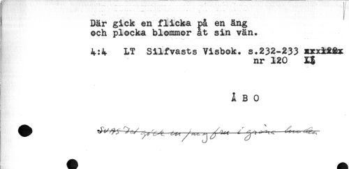 //// ' K' ' //// ! Där gick en flicka på en äng //// och plocka blommor åt sin vän* //// ^ " * ** //// 4:4 LT Silfvasts Visbok, s.232-233 //// nr 120 H //// f //// ! //// ÅBO //// t ////