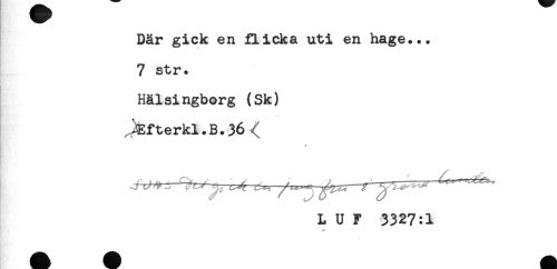 //// Där gick en flicka uti en hage... //// 7 str. //// Hälsingborg (Sk) //// J^fterkl.B.36 //// * //// i f. i.a : Qr. ! ^ - ^ ,' , , ' , ' ' " //// L U F 3327:1 ////