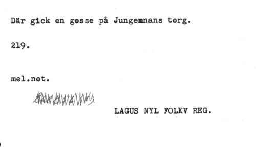 //// Där gick en gosse på Jungemnans torg. //// 219. //// mel.not. //// LAGUS NYL FOUV KEG. //// t ////