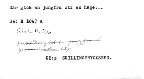 //// Där gick en jungfru uti en hage... //// Se: R 1347 a //// f'-; ' - ^ //// KB:s SKILLINGTRYCKSREG. ////