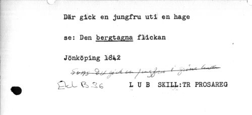 //// I Bär gick en jungfru uti en hage //// se: Den bergtagna flickan //// + //// - //// Jönköping 1842 //// ^ Q^L^.^ LUB SKILL:TRPROSAREG ////