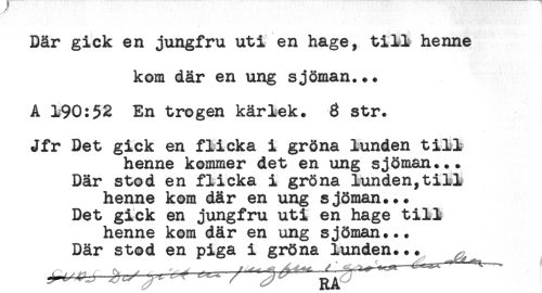 //// Där gick en jungfru uti en hage, till henne //// kom där en ung sjöman... //// A 190:52 En trogen kärlek. 3 str. //// Jfr Det gick en flicka i gröna lunden till //// henne kommer det en ung sjöman... //// Där stod en flicka i gröna lunden,till //// henne kom där en ung sjöman... //// Det gick en jungfru uti en hage till //// henne kom där en ung sjöman... //// Där stod en piga i gröna lunden... ////