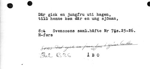 //// Bår gick en jungfru uti hagen, //// till henne kom där en ung sjöman, //// 8:4 Svenssons saml.häfte Nr 7$s.25-26. //// H-fors //// ÅBO ////