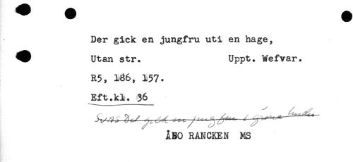 //// Der gick en jungfru uti en hage, //// ^ Utan str. Uppt + Wefvar. //// Eft.kl. 36 //// -_-___ //// ÅBO RANCKEN MS ////
