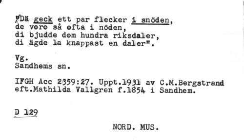 //// /Dä geck ett par flecker i snöden. //// de vore så ofta i nöden, //// di bjudde dom hundra riksdaler, //// di ägde la knappast en daler". //// Vg. //// Sandhems sn. //// IFGH Acc 2359:27. Uppt.1931 av C.M.Bergstrand //// eft.Mathilda Vallgren f.1854 i Sandhem. //// D 129 //// NORD. MUS. ////