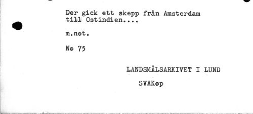 //// Wi)'' //// Der gick ett skepp från Amsterdam //// ^ till Ostindien.... //// m.not. //// No 75 //// ! //// LANDSMÅLSARKIVET I LUND //// SVAKop ////