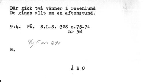 //// Där gick två vänner i rosenlund //// De gingo allt om en aftonstund. //// 9:4. PÄ. S.L.S. 328 s.73-74 //// nr $8 //// N. ////