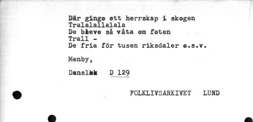 //// ......« '";...... ...... ..... . ..... //// Där gingo ett herrskap i skogen //// Tralalallalala ' //// De bievo så våta om foten //// Trall - //// De fria för tusen riksdaler o.s.v. //// - - * //// Menby, //// Dansläk D 129 //// ^ FOLKLIYSARKIVET LUND ////