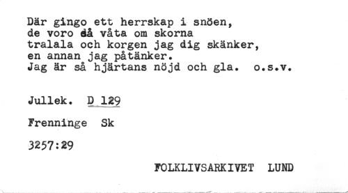 //// Där gingo ett herrskap i snöen, //// de voro då våta om skorna //// tralala och korgen jag dig skänker, //// en annan jag påtänker. //// Jag år så hjärtans nöjd och gla. o.s.v. //// Jullek. D 129 //// Frenninge Sk //// 3257:29 //// FOLKLIVSARKIVET LUND ////