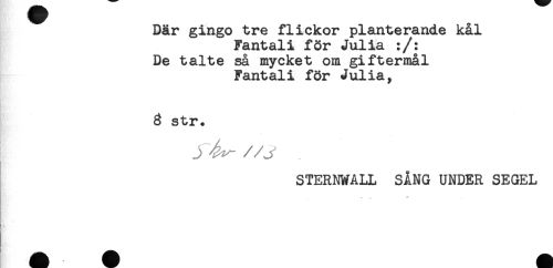 //// Där gingo tre flickor planterande kål //// Fantali för Julia :/: //// De talte så mycket om giftermål //// Fantali för Julia, //// 3 str. //// j ^ /A) //// STERNWALL SÅNG UNDER SEGEL ////