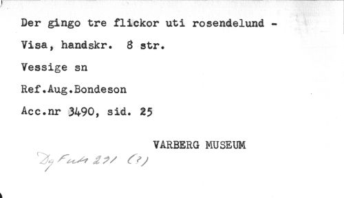 //// Der gingo tre flickor uti rosendelund - //// Visa, hand skr. 3 str. //// Vessige sn //// Ref.Åug.Bonde son //// Acc.nr $490, sid. 25 //// VÅRBERG MUSEUM ////