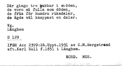 //// Där gingo tre jgubbar i snöden, //// de voro så fulla som döden, //// de ffia för hundra riksdaler, //// de ägde väl knappast en daler* //// Vg. //// Långhem //// D 129 //// IFGH Acc 2399:26.Uppt.1931 av C.M.Bergstrand //// eft.Karl Hall f.1851 i Länghem. //// NORD. MUS. //// 4 //// ' t ////