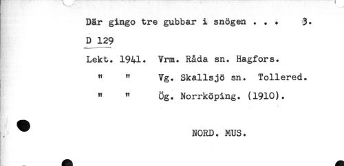 //// Där gingo tre gubbar i snögen ... 3* //// D 129 //// Lekt. 1941. Vrm. Råda sn. Hagfors. //// " " Vg. Skallsjö sn. Tollered. //// " " Ög. Norrköping. (1910). //// . ^ NORD. MUS. ////