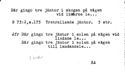 //// Där gingo tre jäntor i skogen på vägen //// vid linhrne le... //// B 73:2,s.175 Tretrallande jäntor. 5 str. //// ! //// Jfr Där gingo tre jäntor i solen på vägen vid //// lindane le... //// Där gingo tre jäntor i solen på vägen ! //// till landandele... //// * //// i ////