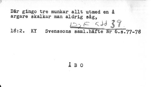 //// Där gingo tre munkar allt utmed en å //// argare skalkar man aldrig såg, //// 13:2. KY Svens so ns saml. hä?t e Nr 6Tsl77--73 //// ÅBO ////