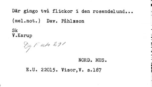 //// Där gingo två flickor i den rosendelund... ^ //// F= //// (mel.not.) Dav. Påhlsson //// Sk //// V.Karup ; //// / ^ // ! //// NORD. MUS. ; //// E.U. 22015. Visor,V. s.137 ! ////