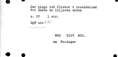 //// Der gingo två flickor i rosendelund //// Att skåda de liljorna sköna //// s. 57 1 Str. //// DgF utr << //// MUS HIST MUS. //// ms Enninger //// , //// H a ////