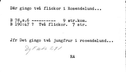 //// Där gingo två flickor i Rosendelund... //// B 78,s.6---- 9 str.kom. //// B 190:47 ? Två flickor. 7 str. //// g //// * 5 //// * //// H //// H //// Jfr Det gingo två jungfrur i rosendelund... ' //// H //// g I //// RA ! ////