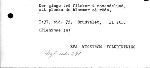 //// Der gingo två flickor i rosendelund, //// att plocka de blommor så röda, //// 1:37, sid. 75, Brudvalet, 11 str. //// (Fleninge sn) //// * //// EVA WIGSTRÖM FOLKDIKTNING ////