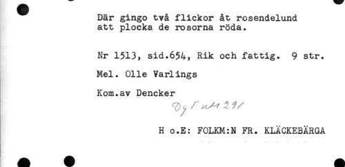 //// Där gingo två flickor åt rosendelund //// att plocka de rosorna röda. //// Nr 1513, sid.654, Rik och fattig. 9 str. //// Mel. Olle Vari ing s //// Kom.av Dencker //// J //// /H o.E: FOLKM:N FR. KLÄCKEBÄRGA ////