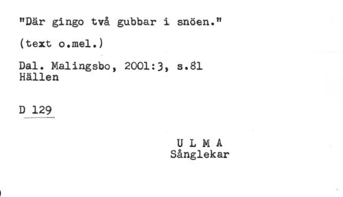 //// "Där gingo två gubbar i snöen." //// (text o.mel.) //// Dal. Malingsbo, 2001:3, s.8l //// Hällen //// D 129 //// U L M A //// Sånglekar //// < ////