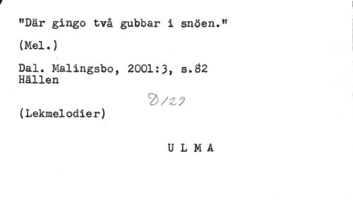 //// "Bär gingo två gubbar i snöen." //// (Mel.) //// Dal. Malingsbo, 2001:3, s.32 //// Hällen //// (Lekmelodier) //// U L M A ////