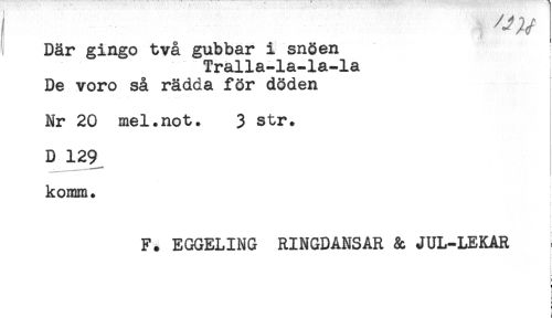 //// Där gingo två gubbar i snöen //// Tralla-la-la-la //// De voro så rädda för döden //// Nr 20 mel.not. 3 str. //// D 129 //// komm. //// f //// F. EGGELING RINGDANSAR & JUL-LEKAR //// } //// ) //// ' ////