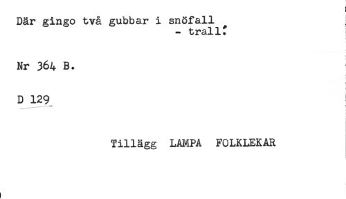 //// Där gingo två gubbar i snöfall //// - trallf //// Nr 364 B. //// ] //// t //// D 129 //// t //// t //// Tillägg LAMPA FOLKLEKAR ////