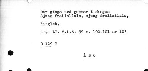 //// Där gingo två gummor i skogen //// Sjung frailallala, sjung frallallala, //// Ringlek. //// 4:4 LI. S.L.S. 99 s. 100-101 nr 103 //// D 129 ? //// * ÅBO //// h //// - ////