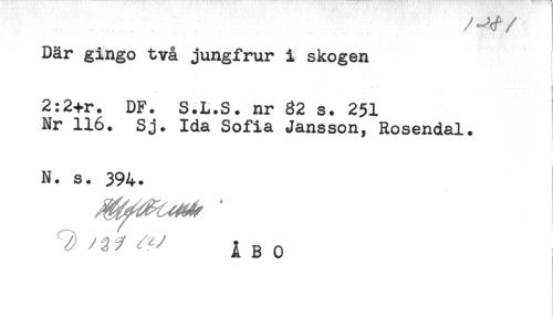 //// Där gingo två jungfrur i skogen //// 2:2+r. DF. S.L.S. nr 82 s. 251 //// Nr 116. Sj. Ida Sofia Jansson, Rosendal. //// N. s. 394. //// ^ g 0 ////