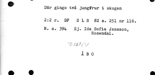 //// Där gingo två jungfrur i skogen //// 2:2 r. DF S L S 82 s. 251 nr 116. //// N. s. 394 Sj. Ida Sofia Jansson, //// Rosendal. //// V ^ //// ÅBO ////