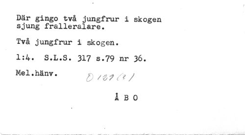 //// Där gingo två jungfrur i skogen //// sjung fralleralare. //// Två jungfrur i skogen. //// 1:4. S.L.S. 317 s.79 nr 36. //// Mel.hänv. , ^^ //// ÅBO //// * ////