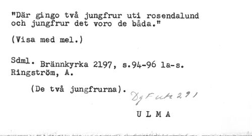 //// "Där gingo två jungfrur uti rosendalund //// och jungfrur det voro de båda." //// (Visa med mel.) //// Sdml. Brännkyrka 2197, s.94-96 la-s. //// Ringström, A. //// (De två jungfrurna). //// U L M A ////