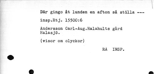 //// Där gingo åt lunden en afton så stilla --- //// insp+Rtj. 15500:6 //// Andersson Carl-Aug.Halahults gård //// Halasjö. //// (visor om olyckor) //// RA INSP. ////