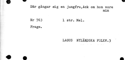 //// Där gångar sig en jungfru,Ack om hon vore //// min //// Nr 763 1 str. Mel. //// Fragm. //// LAGUS NYLÄNDSKA F0LKV.3 //// - -' - ..... //// n ////