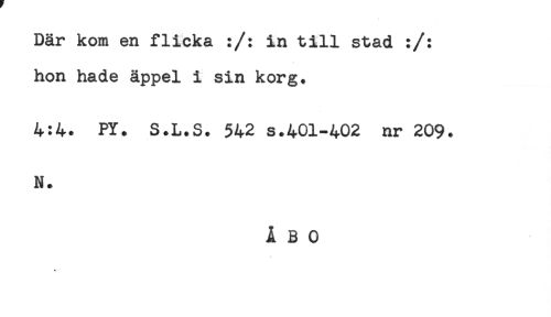 //// Där kom en flicka :/: in till stad :/: //// hon hade äppel i sin korg. //// 4:4. PY. S.L.S. 542 s.401-402 nr 209. //// N. //// ÅBO ////
