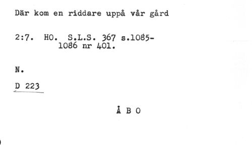 //// Där kom en riddare uppå vår gård //// 2:7. HO. S.L.S. 367 s.1085- //// 1086 nr 401. //// N. //// D 223 //// ÅBO ////