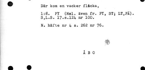 //// * Där kom en vacker fl&cka, //// - //// 1:8. PY (Mel. även fr. PY, ST; LT,PÄ). //// S,L.S. 17.s.124 nr 100. //// N. häfte nr 4 s. 262 nr 76. //// ÅBO ////