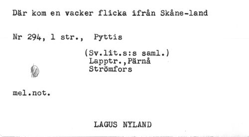 //// Där kom en vacker flicka ifrån Skåne-land //// Nr 294, 1 str., Pyttis //// (Sv.lit.s:s saml.) //// Lapptr.yPämå //// jg) Strömfors //// mel.not. //// LAGUS NYLAND ////