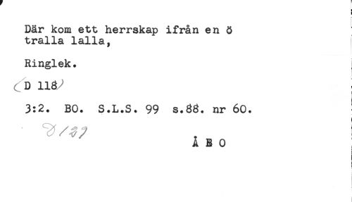 //// H //// ] //// Där kom ett herrskap ifrån en ö //// tralla lalla, //// Ringlek. ! //// D //// : //// 3:2. BO. S.L.S. 99 s.88. nr 60. //// A B 0 //// i //// ! ////