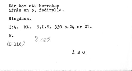 //// Där kom ett herrskap //// ifrån en 8, fadiralla. //// Ringdans. //// 3:4- MA. S.L.S. 330 s.24 nr 21. //// (La; ^^ //// ÅBO ////