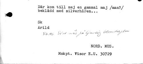 //// Där kom till mej en gammal maj /man? //// /^^ beklädd med silverhåren... //// Sk //// Arild //// * //// NORD. MUS. //// Mskpt. Visor E.U. 30729 ////