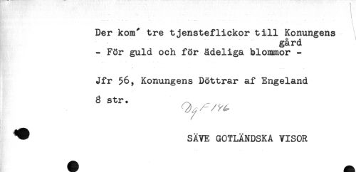 //// . * //// *" ...... ...... . .." ' i //// Der kom" tre tjensteflickor till Konungens //// gård //// - För guld och för ådeliga blommor - //// * * -.. . . * //// Jfr 56, Konungens Döttrar af Engeland //// 8 str. ^ //// ^ SAVE GOTLÄNDSKA VISOR ////