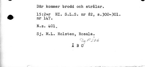 //// Där kommer brodd och strålar. //// ^ 15:2+r Hl. S.L.S. nr 82, s.300-301. //// V nr 147. //// N.s. 401. //// Sj. M.L. Holsten, Rosala. //// ^ ^ ^^ //// Å B ( //// /
