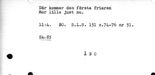 //// Där kommer den första friaren //// Mor lilla just nu. //// . - //// * //// 11:4. BO. S.L.S. 151 s.74-76 nr 51. //// Skv35 //// ^ ÅBO ////