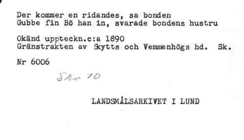 //// Der kommer en ridandes, sa bonden //// Gubbe fin B8 han in, svarade bondens hustru //// Okänd uppteckn.c:a 1390 //// Gränstrakten av Skytts och Vemmenhögs hd. Sk. //// Nr 6006 //// LANDSMÅLSARKIYET I LUND ////